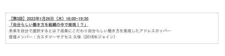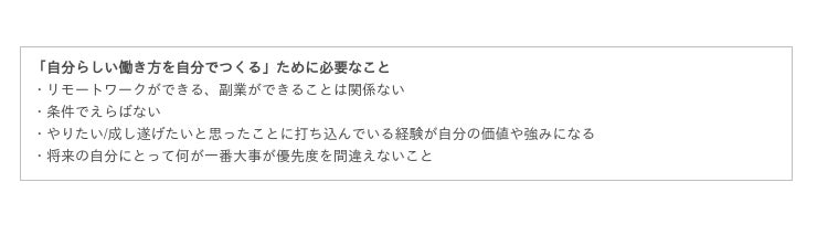 最後に、学生に向けて、「自分らしく働くために」「自分で環境を選ぶために」大事なことをメッセージとして伝えました。働くことも生きることも自分らしく作っていくためには「自分がしたいことに正直になろう!」と伝えました。