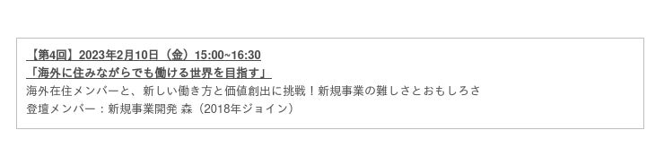 現在はニットで働きながらオーストラリアで生活をしている森が、新卒から現在までの経歴について紹介しました。仕事も続けながら、将来的には半年は日本で、残りの半年はオーストラリアで生活し、1年を通して夏の気候の中で生活をしたいと話しました。