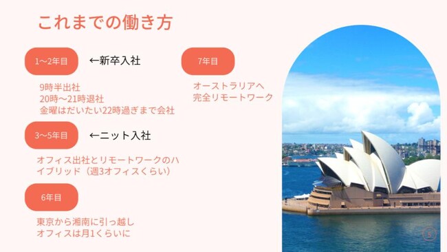 新卒からどうやって働いてきたのか伝えてもらいました。新卒で入社したマーケティング会社では、毎日出社して働いていました。そこからニットに転職をして、ハイブリッドワークにシフト。その後昨年にはオーストラリアに行き、海外からリモートワークで働いています。