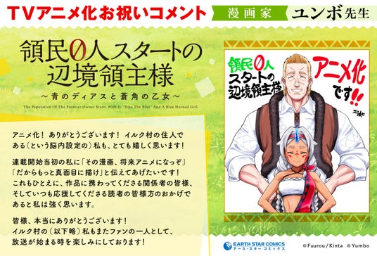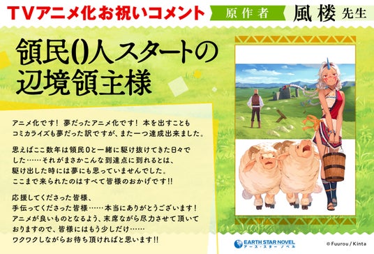 このたび、株式会社アース・スター エンターテイメント(東京都・品川区)が刊行する【アース・スターノベル】と【アース・スター コミックス】にてシリーズ累計200万部を突破している人気作品『領民0人スタートの辺境領主様』のTVアニメ化を、本日同社が主催している「アース・スターノベル10周年夏祭り」内にて発表いたしました。