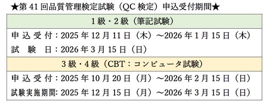 一般財団法人日本規格協会(本部:東京都港区、理事長:朝日弘)は、第41回 品質管理検定(QC検定)3級・4級の申込受付を開始いたしました。(※1級・2級は12月11日より受付開始予定です。)