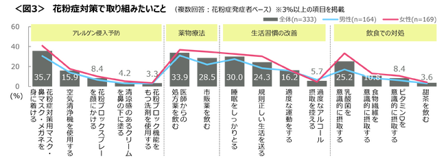 花粉症対策で取り組みたいことは、「処方薬」「市販薬」を飲む薬物療法、「マスク・メガネの着用」でアレルゲン侵入予防 、「睡眠をしっかりとる」など生活習慣の改善をあげる人が目立つ。