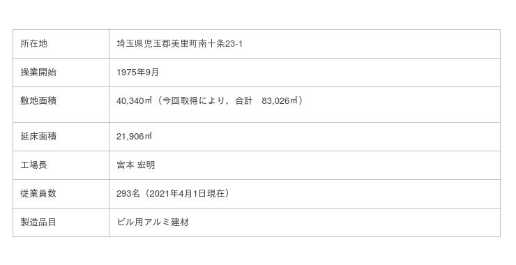 YKK AP埼玉工場は、ビル用アルミ建材商品の製造拠点です。関越自動車道 寄居スマートインターチェンジに近接し、首都圏の建築需要地にアクセスしやすい立地です。YKK APは2021年度の重点施策として、『ビル事業の首都圏強化とモノづくり改革』を掲げており、今回の用地取得により新たに工場を増強し、首都圏を始めとする東日本エリアへの競争力を高めるビル事業の基幹工場として、製造供給体制を再編します。