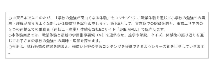 JRE MALLの商品カテゴリー「職業体験学習」からお求めいただけます。
