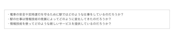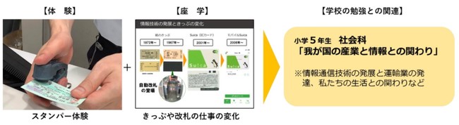 改札の仕事等を題材に、鉄道の安全や定時運行を守るための秘密や、情報技術の発展と改札業務の変化を知ることで、小学校5年生の社会科の理解を深めます!