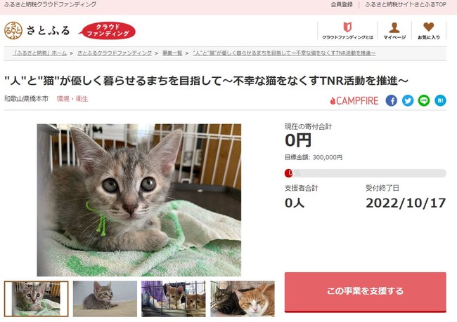 和歌山県橋本市とふるさと納税ポータルサイト「さとふる」(https://www.satofull.jp/)を運営する株式会社さとふる(本社:東京都中央区、代表取締役社長:藤井 宏明)は、寄付金の使途に応じて事業を立ち上げ寄付を募る「さとふるクラウドファンディング」(https://www.satofull.jp/projects/top.php)にて、飼い主のいない猫を捕獲し、不妊去勢手術を施したうえで元の場所に戻し不必要な繁殖を抑えるTNR活動を推進し、“人”と“猫”が住みやすい環境を整えるため、2022年9月1日より寄付受け付けを開始します。