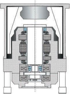 超高速回転のターボ分子ポンプには磁気ベアリングが用いられますが、万が一電源遮断したときや磁気装置が故障したときにブレードが破損しないよう保護用としてタッチダウンベアリングが使用されます。過酷な環境下でのタッチダウンベアリングの寿命向上のために、総玉形組合せセラミックベアリングが採用されています。