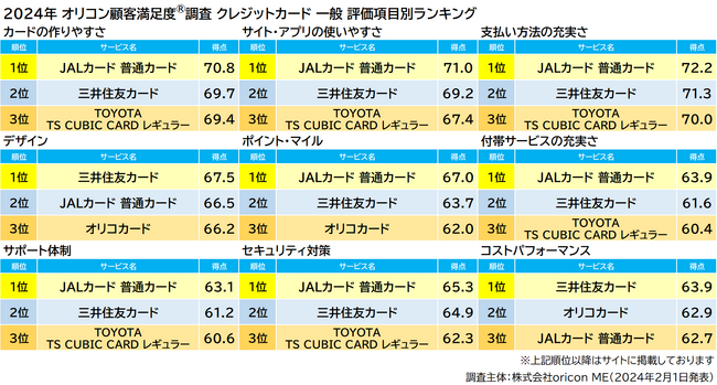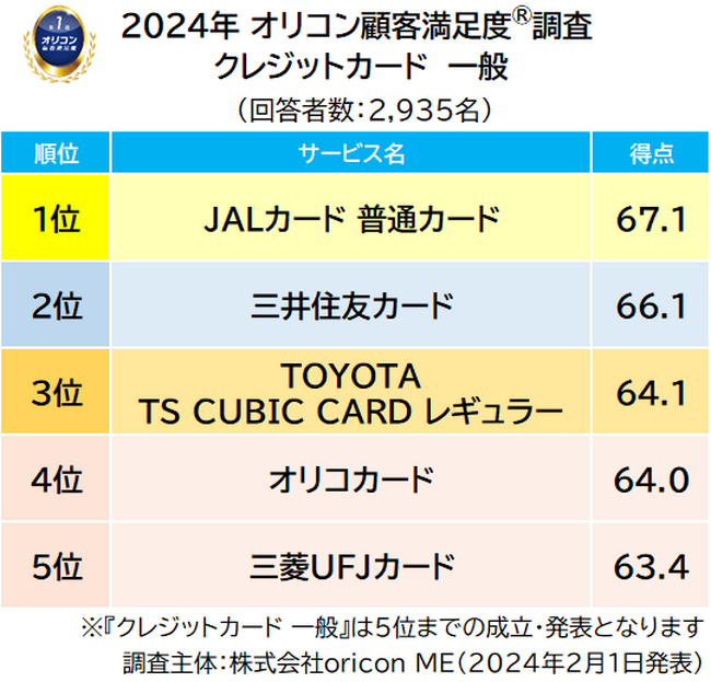 実際のサービス利用者を対象に第三者の立場で顧客満足度調査を実施する株式会社oricon ME(本社:東京都港区 代表取締役社長:小池 恒 略称:オリコン)は、『クレジットカード』についての満足度調査を実施し、2024年2月1日(木)14時にその結果を「オリコン顧客満足度(R)」公式サイト内( https://life.oricon.co.jp/ )にて発表いたしました。結果は以下の通りとなりました。