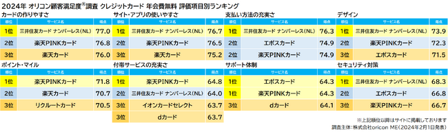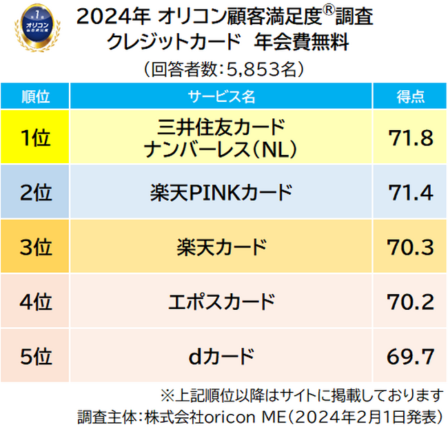 2024年 オリコン顧客満足度(R)調査 クレジットカード 年会費無料
