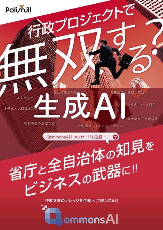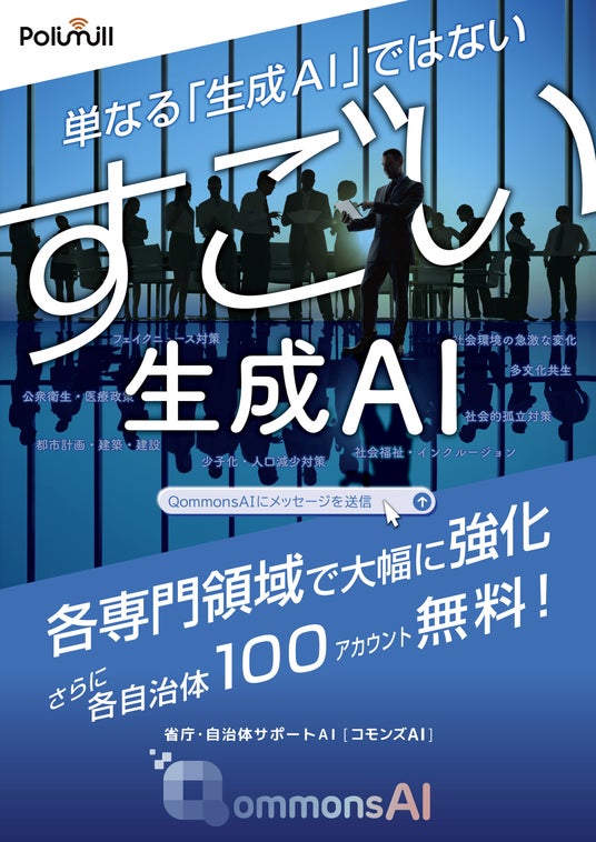 Polimill株式会社は、各専門領域で大幅に強化された行政サポート生成AI【QommonsAI】(コモンズAI)と、誰でも安心して簡単にまちづくり・まちたたみに参加できるSNS【Surfvote】(サーフボート)を開発・運営・提供するICTスタートアップ企業です。