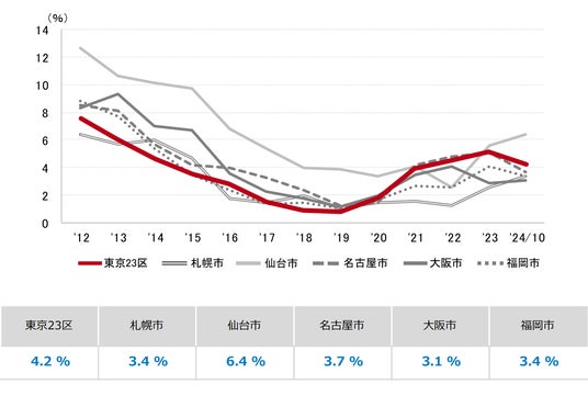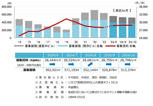 三幸エステート株式会社(本社:東京都中央区、取締役社長:武井重夫)は、2024年10月度の東京都心5区(千代田区、中央区、港区、新宿区、渋谷区)および全国6大都市(東京、札幌、仙台、名古屋、大阪、福岡)の大規模ビル※1のマーケットデータをまとめた「オフィスマーケット2024年11月号」を公表します。