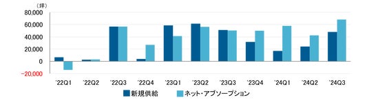 ネット・アブソープション(吸収需要)はオフィス需要の指標であり、一定期間におけるテナント入居面積(稼働面積)の増減を表す。2023年第1~第3四半期は、都心部での大量供給を背景に供給過剰が続いたが、2023年第4四半期からは4期連続で需要が供給を上回る需要超過となった。直近2024年第3四半期は約7万坪の高水準となり、足元のオフィス需要は力強さを見せている。