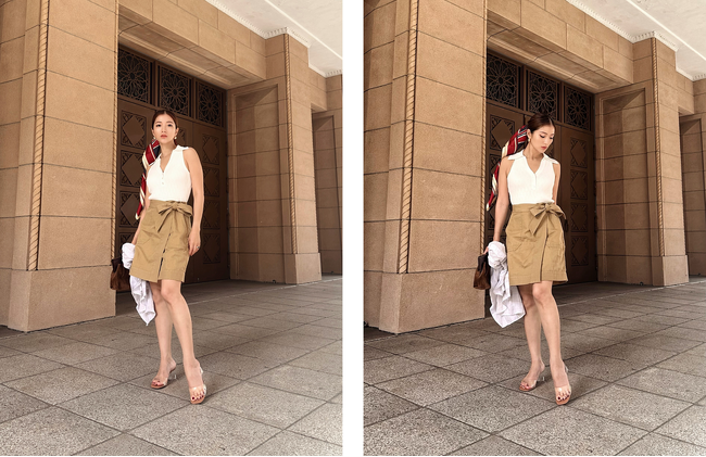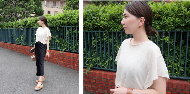 夏の定番のリネンTシャツにシルクスカートを合わせた抜け感のあるアーバンスタイル。トップスはドレープの美しいフラッタースリーブで二の腕をさりげなくカバーし、スタイルアップ効果も抜群な1着。