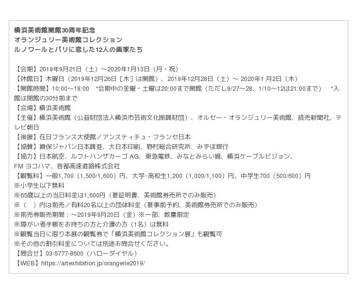 販売場所:展覧会公式サイト https://artexhibition.jp/orangerie2019/tickets/