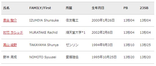 2024年5月19日(日)に国立競技場にて開催する「セイコーゴールデングランプリ陸上2024東京(https://goldengrandprix-japan.com/)」の男子110mハードル・男子400mハードル・女子100mハードルに出場を予定している選手を下記の通りお知らせいたします。男子110mハードルには、ブダペスト2023世界選手権(https://www.jaaf.or.jp/wch/budapest2023/)で日本人初のファイナリストとなり5位入賞を果たした泉谷駿介(住友電工)、杭州2022アジア競技大会(https://www.jaaf.or.jp/competition/detail/1773/)金メダリストの高山峻野(ゼンリン)、泉谷に並ぶ13秒04の日本記録保持者の村竹ラシッド(順天堂大学)、日本グランプリシリーズ2023シリーズ(https://www.jaaf.or.jp/gp-series/news/article/19295/)チャンピオンの野本周成(愛媛陸協)の出場が決定しました。男子400mハードルにはパリ2024オリンピックの参加標準記録を突破している豊田兼(慶應義塾大学)、黒川和樹(法政大学)、バンコク2023アジア選手権(https://www.jaaf.or.jp/competition/detail/1760/)銀メダリストの児玉悠作(ノジマT&FC)が出場予定。女子100mハードルにはブダペスト2023世界選手権日本代表で日本グランプリシリーズ2023シリーズチャンピオンの寺田明日香(ジャパンクリエイト)、同大会日本代表の青木益未(七十七銀行)、田中佑美(富士通)の3名が出場予定です。本大会はワールドアスレティックスが主催するダイヤモンドリーグ以外の世界最高となるシリーズ「ワールドアスレティックスコンチネンタルツアー」最上位・ゴールドとして開催いたします。