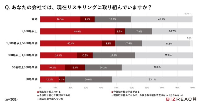 一方で、現在リスキリングに取り組んでいると回答した企業は26.3%となりました。企業規模でみると、従業員数5,000名以上の企業が48.9%と最も多く、50名未満の企業が12.2%と最も低い結果となり、企業規模とリスキリングの実施率に相関があることが分かります。