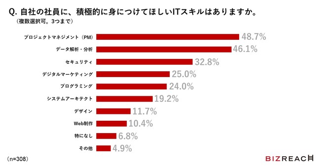 また2位は「データ解析・分析(46.1%)」(前回調査1位)で、3位「セキュリティ(32.8%)」(前回調査4位)という結果になりました。