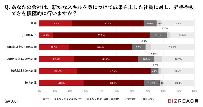 一方で、新たなスキルを身につけて成果を出した社員に対し、昇格や抜てきを積極的に行うと回答した企業は21.4%(「どちらかといえば、行う(45.8 %)」を合わせると67.2%)で、従業員規模が大きくなるほど消極的な企業が多く、リスキリングに取り組む割合が最も高かった従業員数5,000名以上の企業では、8.9%でした。企業のリスキリングの取り組みにおいては、今後、新たなスキルを身につけた社員に対する活躍の機会の提供や創出が課題となってくると推測されます。