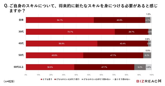 ビジネスパーソンに、「ご自身のスキルについて、将来的に新たなスキルを身につける必要があると感じますか」と尋ねたところ、95.0%が必要性を感じていることが分かりました。「とても思う」と答えた割合は、年代が若いほど高い傾向にあり、30代は70.7%となりました。