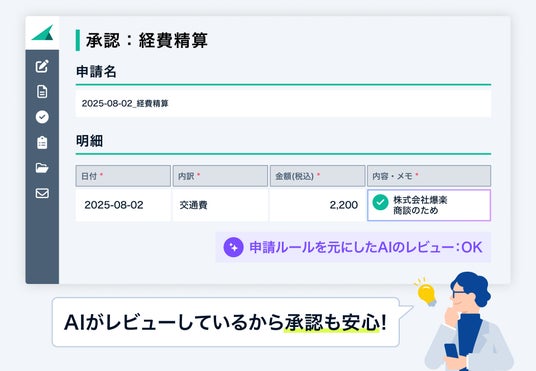 上長などの承認者も、必ずしも社内の規程やルールを全て把握しているわけではありません。申請が、規程やルールに則っているか確認をしなくても、AIが前もってレビューを行ってくれていることで、安心して承認を行うことができます。
