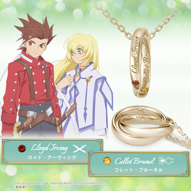 このたびの新作は、ロイド・アーヴィングとペアのダブルリングで、それぞれをイメージした天然石をリングの表面に留め名前を英文で刻印、内側にはイメージアイコンを刻印したデザインのネックレスです。テイルズ オブ シンフォニアは、ユートレジャーコンセプトストア池袋、ユートレジャーオンラインショップで初めて取り扱うライセンスとなります。