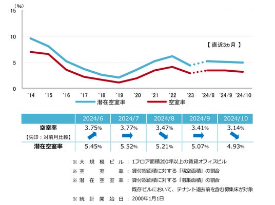 空室率は前月比マイナス0.27ポイントの3.14%となった。3ヵ月連続の低下で、2%台が視野に入りつつある。今年竣工した新築ビルを中心に、立地やビルグレードの改善を目的とした移転により空室床の消化が進み、主な低下要因となっている。潜在空室率は前月比マイナス0.14ポイントの4.93%と、2023年12月以来の4%台となった。