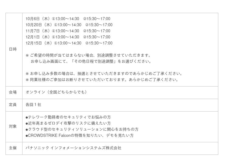 エンドポイントセキュリティ「CrowdStrike Falcon」を対象とした無料の個別相談会です。