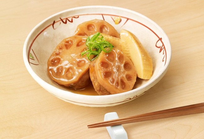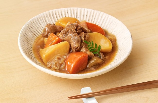 豚バラ肉にじゃがいも・にんじん・玉ねぎ・白滝を加え、3 種の出汁(昆布・かつお節・あご)でじっくり煮込みました。出汁が染み込んだ優しい味わいで、大き目にカットしたじゃがいもやにんじんの存在感も抜群な一品です。