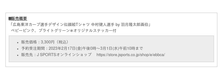 株式会社ジェイ・スポーツ(本社 東京都江東区、代表取締役社長 長谷 一郎、以下「J SPORTS」 ※)が運営する通販サイト「J SPORTSオンラインショップ」で、広島東洋カープのライセンスのもと、選手デザインTシャツを2023年2月17日(金)午後0時より予約販売を開始します。