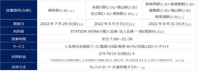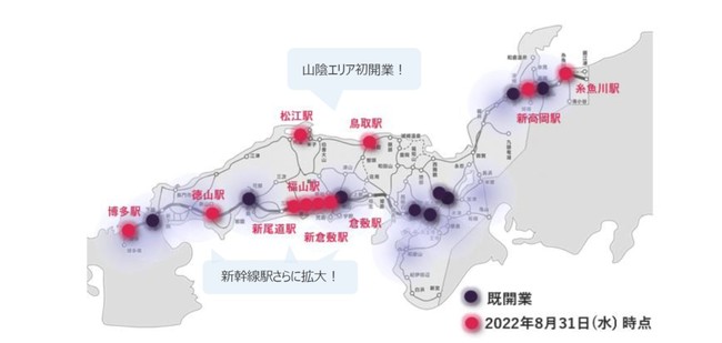 JR西日本エリアのSTATION BOOTHは、今回開業する10カ所を加えて、全19カ所に拡がりました。今後もJR西日本エリアの多くの駅への「STATION BOOTH」の展開を目指します。また2022年6月28日より、これまでご利用いただいているSuica、ICOCA等に加えて、九州エリアの交通系ICカード nimoca、SUGOCA、はやかけんも入退出の鍵としてご利用いただけるようになりました。