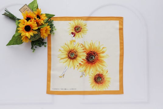 夏の光に輝くハンカチいっぱいのひまわりが印象的な一枚。大きなひまわりを身にまとい軽快に歩く女性を描きました。太陽に向かってまっすぐに咲くひまわりは、その姿から「希望」や「明るい未来」の象徴とされています。新生活のお祝い、誕生日、サマーギフトなど、彩りを添える一枚としておすすめです。