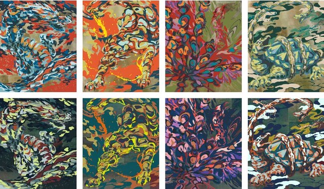 中国の神話、天の四方の方角を司る霊獣である四神(四獣)をモチーフとした版画作品。手描きの絵画をデータに置き換えて制作したり、箔や凹凸感のある表現を使用するなど、普段の絵画制作とは異なるアプローチで制作された意欲作です。東の青龍、西の白虎、南の朱雀、北の玄武それぞれのモチーフごとに、色味を変えた陰・陽各2種類の版画を発表予定。