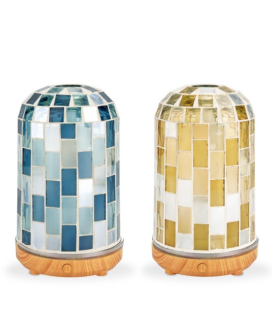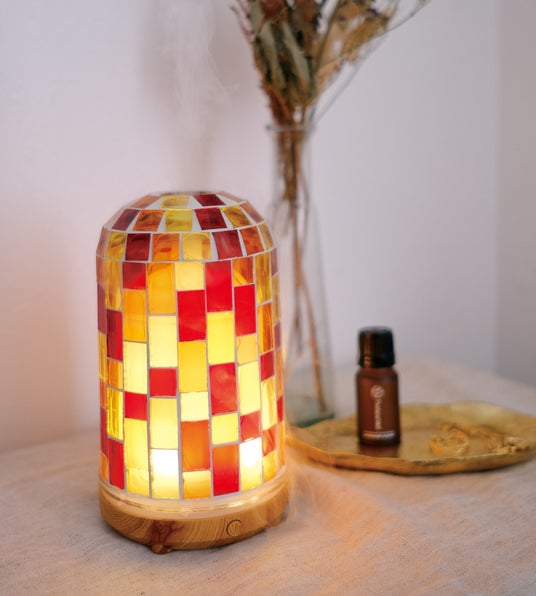 ガラスタイルの灯りがくつろぎの時間を彩るUSB給電式加湿器。アロマウォーターやアロマオイルを直接タンクに入れることで香りも楽しめリラックスタイムに最適です。