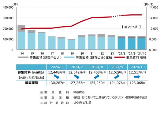 募集賃料は前月比マイナス12円/坪の12,517円/坪となった。前月からほぼ横ばいで、引き続き12,000円/坪台半ばで推移している。