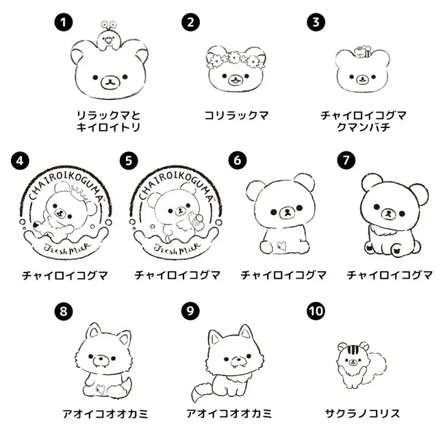リラックマはもちろん、リラックマの仲間のキイロイトリ、コリラックマ、チャイロイコグマ、アオイコオオカミにサクラノコリスまで。見ているだけでほんわか癒されそうな、とってもかわいい10種類から選ぶことができます。