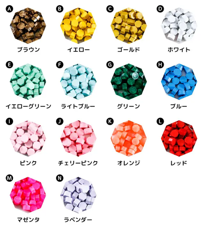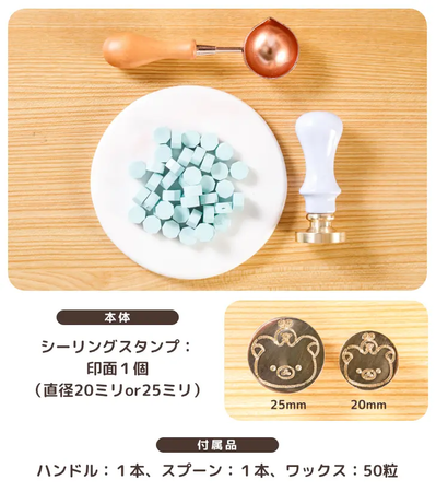 セットには、直径20ミリか25ミリが選べるシーリングスタンプの印面、パステルカラーの8色から選べるかわいいハンドルが各1個。さらに14色から選べるワックスが50粒、ワックスを熱するためのスプーンが付属します。