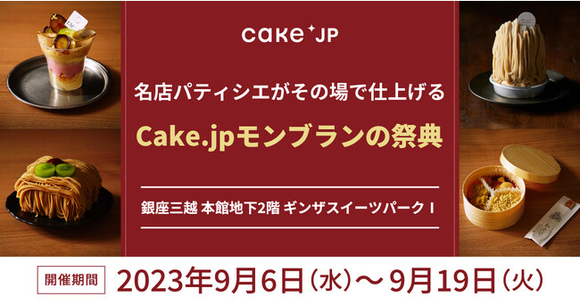 ケーキ・スイーツ専門通販サイト「Cake.jp(ケーキジェーピー)」を運営する株式会社Cake.jp(本社:東京都新宿区、代表取締役:高橋 優貴)は、銀座三越にて旬のスイーツ「モンブラン」を名店パティシエがその場で仕上げてご提供する「モンブランの祭典」を9月6日(水)~9月19日(火)までの14日間開催いたします。会期中は4人のパティシエによる実演販売を行います。
