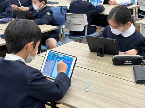 授業では、HALLOのプログラミング教材『Playgram™(プレイグラム)』の中でも、プログラミングの基礎知識が身につく『ミッションモード』に挑戦。最初は「難しい」と頭を悩ませながら取り組んでいた子どもたちも、徐々に「どういう意味か分かった!」「(ミッションをクリアできて)嬉しい!」と集中して次々とプログラミングを進めていく様子が見られました。