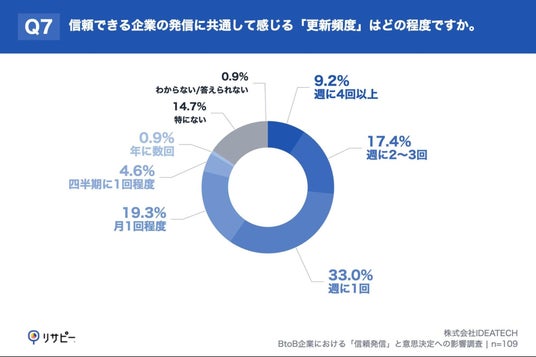 「Q7. 信頼できる企業の発信に共通して感じる「更新頻度」はどの程度ですか。」(n=109)と質問したところ、「週に1回」が 33.0%、「月1回程度」が 19.3%という回答となりました。