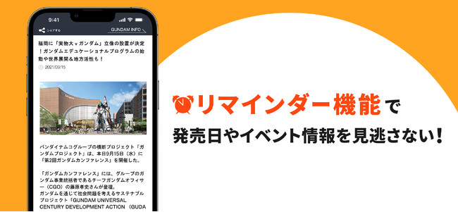 本アプリにはアニメ・ガンプラ・ゲーム・イベントなどガンダムニュースが全て集約されています。また、各公式ガンダム動画がこのアプリ1つで視聴可能なほか、アニメシリーズの登場人物やMS(モビルスーツ)などのデータが閲覧可能な公式データベースも搭載しています。そして、使えば使うほどにあなた好みに最適化された情報が表示されるようになるとともに、気になるニュースはリマインダー機能で忘れないようにプッシュ通知設定ができるなど、便利な要素が盛りだくさんです。