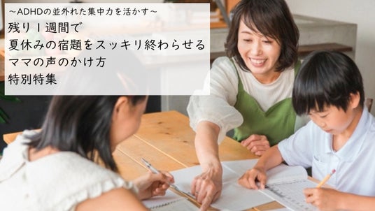 そこでこの度、宿題が先延ばしになっているADHDタイプのお子さんや、心配しているママに向けて『残り1週間で夏休みの宿題をスッキリ終わらせるママの声のかけ方特集』を組み本日よりWebサイトにて公開いたしました。