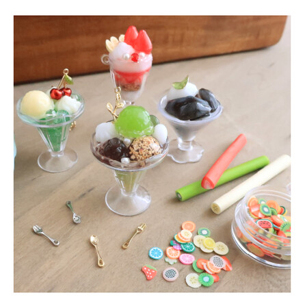 レジンやお好みのパーツでデコレーションして、パフェやカクテル、ドリンクなどのミニチュアスイーツ&ドリンクなどを作る事ができます。