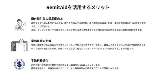 RemitAid社は、海外企業との取引を簡単にするグローバルマルチ決済プラットフォーム「RemitAid(レミットエイド)」を提供するスタートアップです。国や決済手段を問わず、決済や為替にかかる手数料ならびに業務コストや社内コミュニケーションコストを削減する「RemitAid」によって、日本の企業がより安心して海外に挑戦できる環境の構築を目指しております。