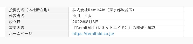 ちゅうぎんキャピタルパートナーズ(岡山市北区丸の内一丁目15番20号ちゅうぎん本店ビル9階 代表取締役 小橋栄紀)は、スタートアップを出資対象とする「ちゅうぎんインフィニティファンド2号」にて、株式会社RemitAid(東京都渋谷区 代表取締役CEO 小川裕大、以下、RemitAid社)の第三者割当増資を引受けました。