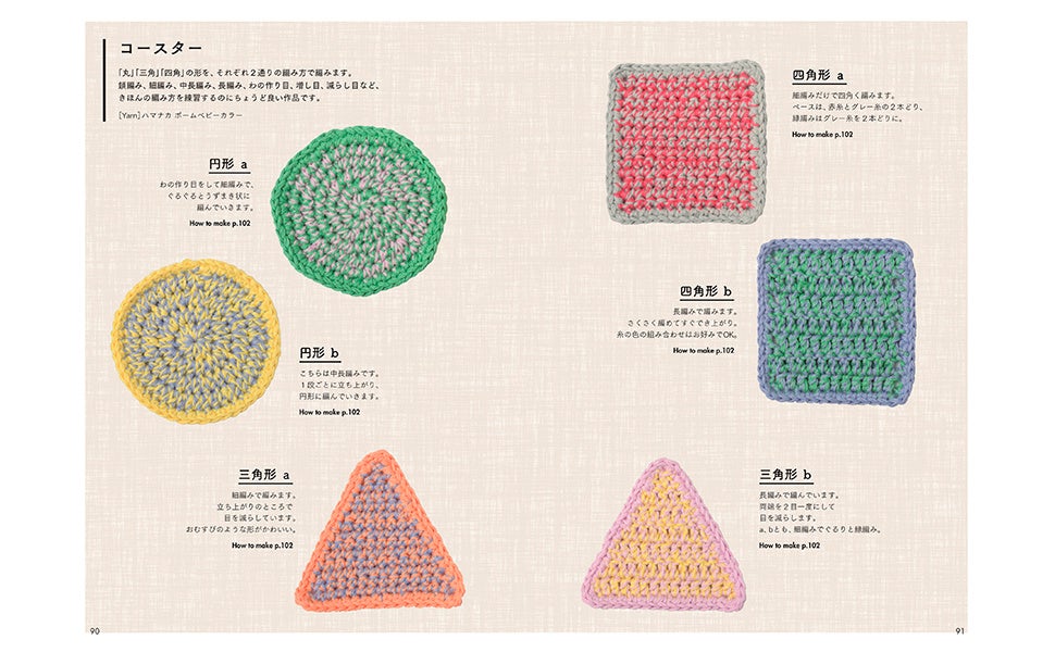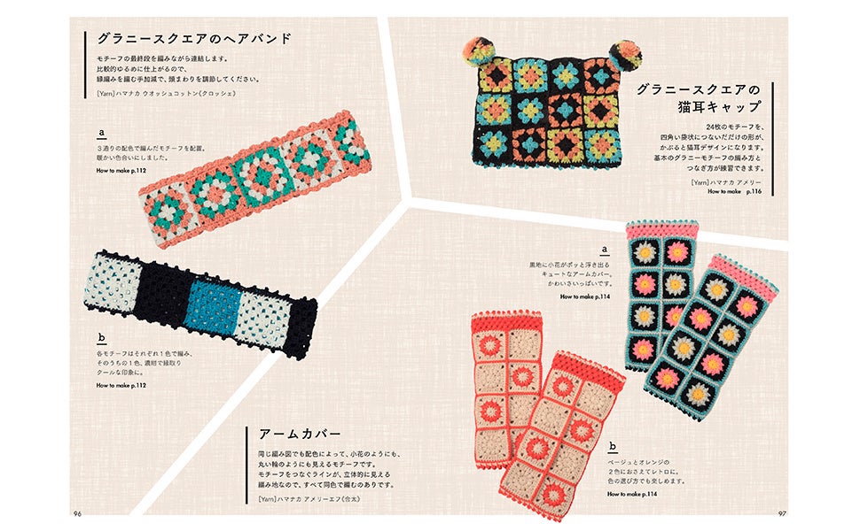 基本の編み方の練習にもなるコースターから、流行りのグラニースクエアアイテムまで、掲載作品18点。全部編めたころには、右利き用の編み図の作品もばっちり編めるようになっているはずです!