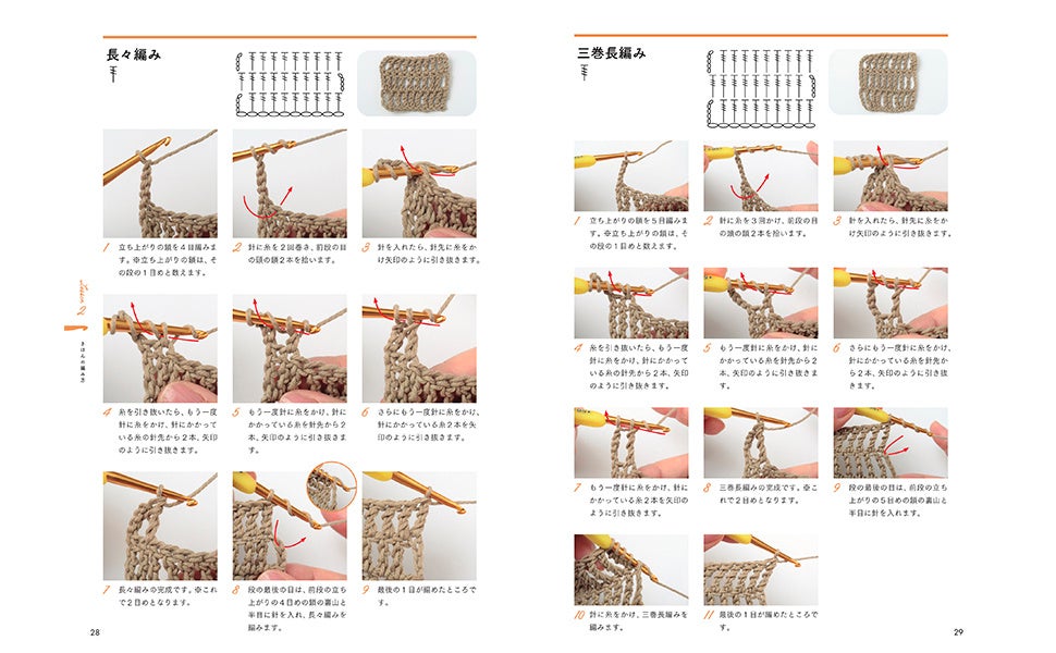 かぎ針の持ち方からはじまり、模様編みやコード編み、糸の始末まで、63種類の編み目記号と22種類の編み方テクニックを掲載。