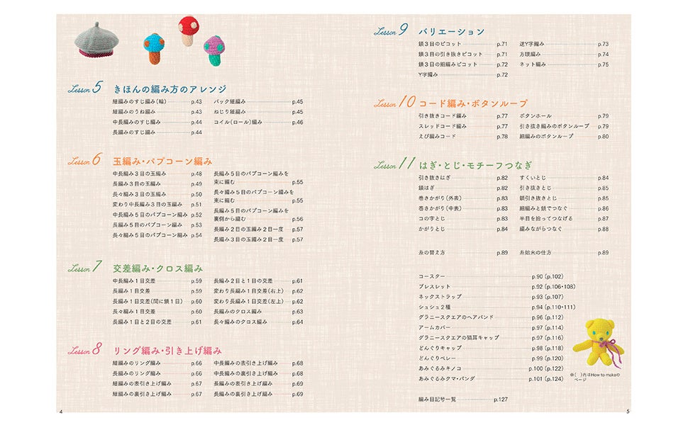 針の持ち方/基本の編み方/増し目/減らし目/基本の編み方のアレンジ/玉編み/パプコーン編み/交差編み/クロス編み/リング編み/引き上げ編み/ピコット/方眼編み/ネット編み/コード編み/モチーフ編み など全85種類の編み方
