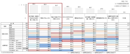 『男性50代』と『女性50代』を比較すると、「運転サポート」は男性の方が20ポイント高く、「環境への配慮」は女性の方が約30ポイント高い。