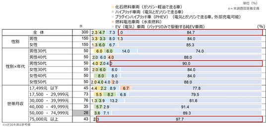 世帯月収別では『17,499元以下』は「ガソリン代がかからないから」「補助金があるから」が全体と比べて高く、費用を重視していることが分かる。