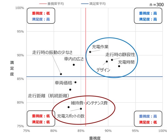 重視度、満足度共にいずれの項目も高い水準であり、各項目を以下の図にプロットすると重視度が高く、満足度が高い象限では「充電作業」「デザイン」「走行時の静寂性」「充電時間」が位置している。